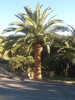 Canary Island Date Palm should be grown in full sun on fertile, moist soil for best growth, but is tolerant of any well-drained soil. It can be planted on the inland side of coastal condominiums and large homes due to moderately high salt tolerance. It does well as a street or avenue tree, even in confined soil spaces. Canary Island Date Palm will require pruning to remove old fronds. Avoid damage to the trunk by locating it properly in the landscape and keeping landscape maintenance equipment away. Only prune fronds that hang below the horizontal. Do not remove those growing upright since this may slow the growth and reduce vigor.